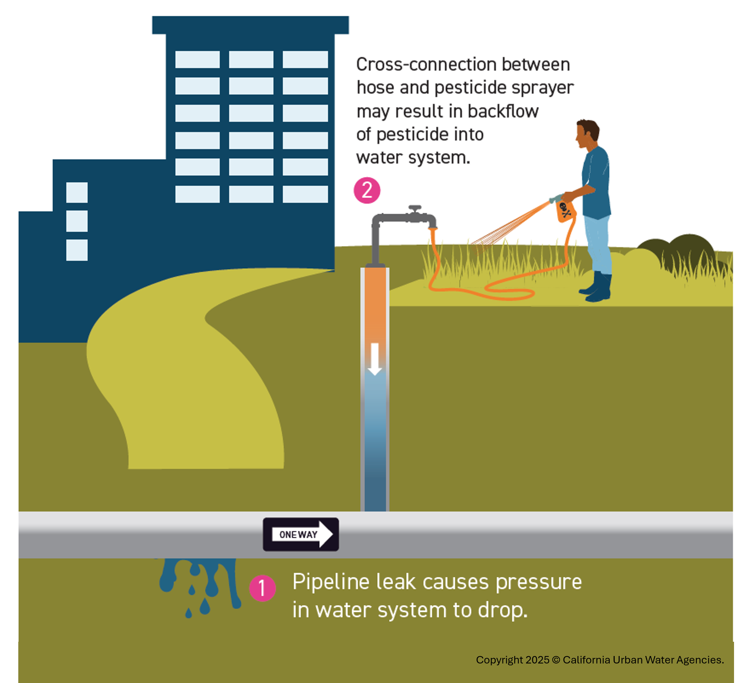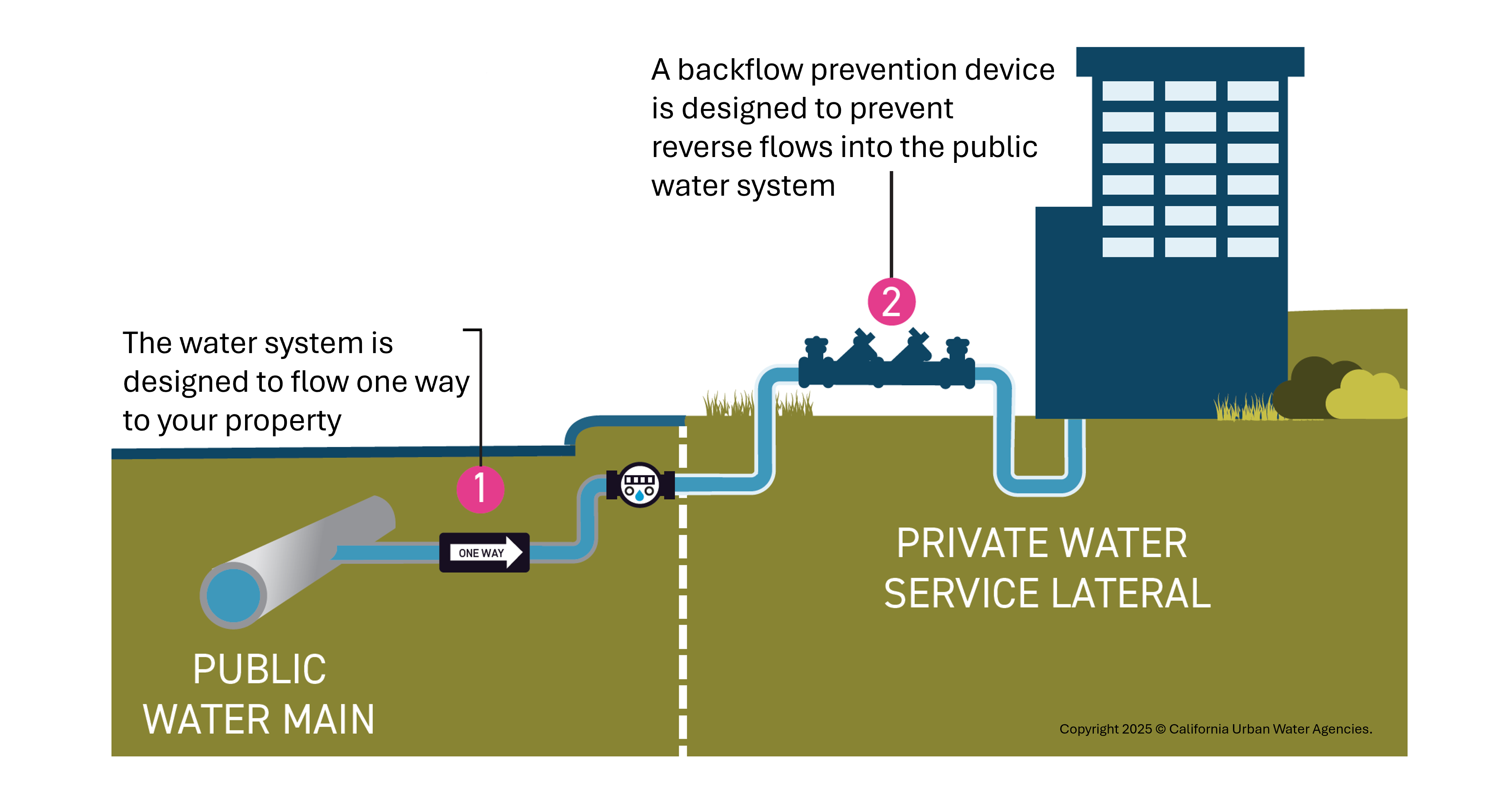 Water distribution systems are designed to have higher water pressure than a customer’s private plumbing to keep water flowing in the right direction. If there is a significant drop in water pressure in one of OMWD’s main pipelines, a reverse flow, or backflow, from a customer’s property could occur.